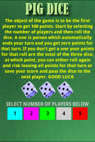 Sra Casado Teaches Bilinguals: 3 Awesome Dice Games to ... from 3.bp.blogspot.com I never came up with any procedural decomposition before writing it so it's more like patching holes one by one. On each person's turn that person has the option of either: In this paper, we mathematically explore a more subjective question: You win by being the first player to score 100 or more points. Pig is a simple dice game which in its basic form is playable with just a single die. So how do you play pig? Roll one die for your first turn. It is a game that is popular among players can use this game to create their own strategies as to whether they should keep rolling or not.